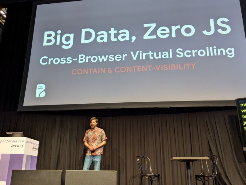 Michael Hladky - Big Data, Zero JS: virtual scrolling  SummaryHow some lesser used CSS can improve performance. Not the easiest talk to take notes on, as it was highly visual with a lot of live demos, which was very brave of Michael! But I would summarise it as "useful CSS properties which gives the browser contextual information about what might happen within a container and how changes should be limited to certain areas of the page. I definitely feel this is something I need to read up more on, I do not really understand the basics of it. Key Points- Useful tool to understand which CSS causes which rendering processes: CSS-Triggers